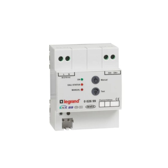 Bộ Điều Chỉnh Độ Sáng Đèn KNX DALI DimmerThiết bị Legrand 002665 là giao diện 1 kênh KNX/DALI có khả năng quản lý tối đa 64 địa chỉ driver được chia thành 16 nhóm. Quản lý thông qua cảm biến hiện diện DALI trong 8 nhóm và có khả năng điều khiển các thiết bị DALI ECK (bộ chuyển đổi khẩn cấp) qua các chương trình kiểm tra tự động có thể cấu hình.Thông số kỹ thuật:16 nhóm đèn với 64 kịch bản ánh sángViệc đánh địa chỉ và phân nhóm các thiết bị DALI có thể diễn ra thông qua phần mềm PCDuy trì ánh sáng liên tụcChức năng Burn-inChức năng tối ưu phạm vi quan sát corridor với cảm biến hiện diệnDimmingChức năng quét để tắt đèn theo thứ tự nhất địnhKết nối Bus qua đầu nối KNX đỏ đen. Điện áp nguồn 110-240V 50-60 Hz. Lắp đặt trên đường ray DIN. Kích thước: 4 mô-đun DIN. Thiết bị Legrand 002699 hoạt động trên cổng KNX/DALI, tức hoạt động giữa bus KNX và bus DALI để điều khiển riêng từng tải DALI (tối đa 64 thiết bị DALI)