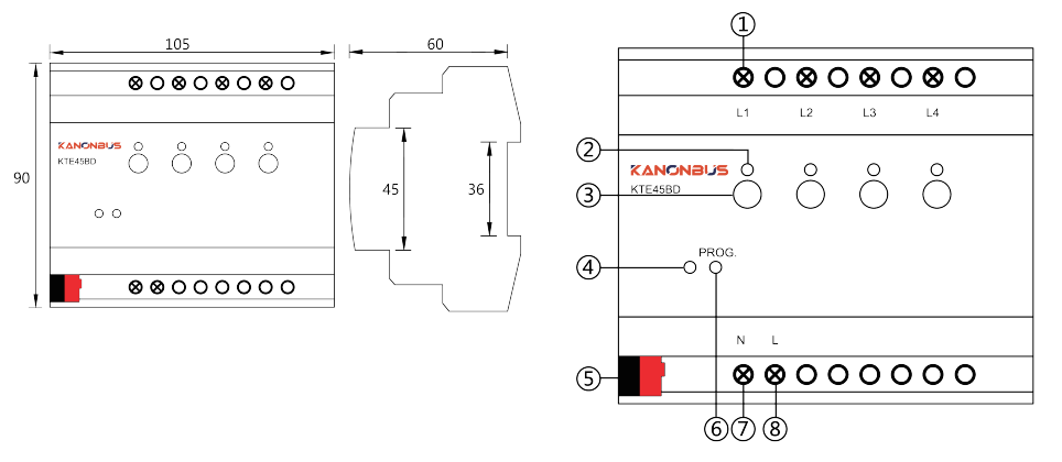 - Bộ điều khiển KTE45BD sử dụng đầu cuối bus để kết nối và được cấp nguồn bằng nguồn điện KNX.